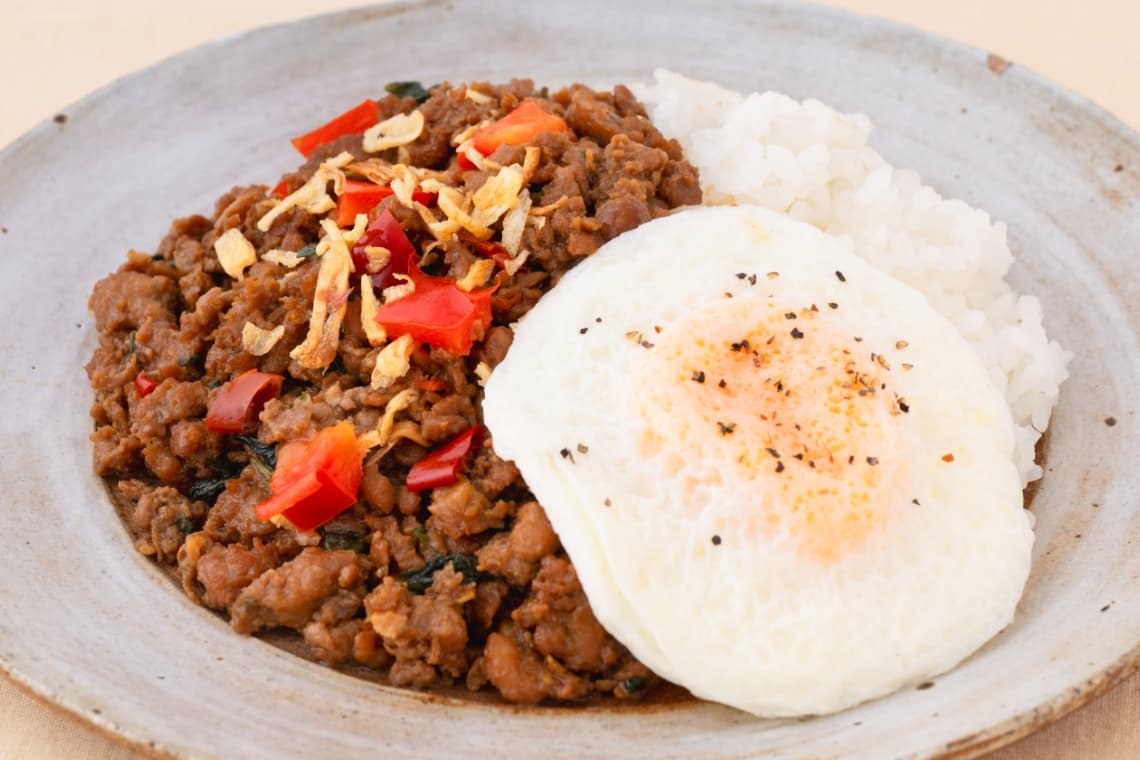Basil chicken made with stir-fried ground chicken in a sweet and savory sauce. Mixing in the fried egg adds extra richness and a mellow, creamy flavor. It is mild and enjoyable.