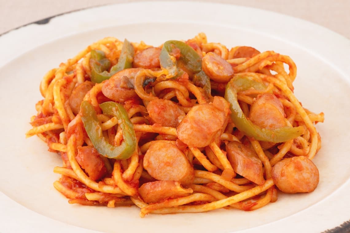 A Japanese-born Napolitan spaghetti known for its rich and appetizing tomato ketchup flavor. Made with green peppers, onions, sausage, and more, this dish is a classic example of Japanese yoshoku cuisine (Western-influenced Japanese cuisine).