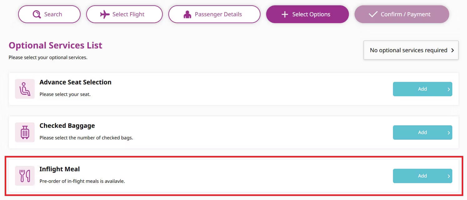 * If you have not yet purchased your flight ticket, you can order your meal when you book your ticket.