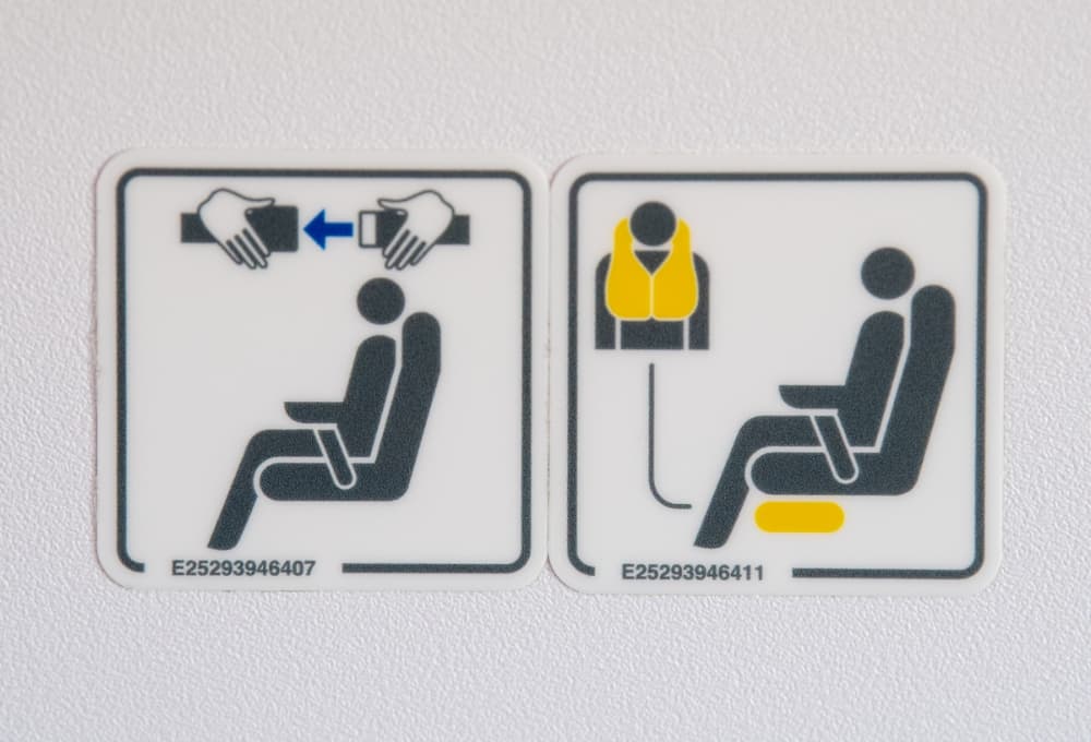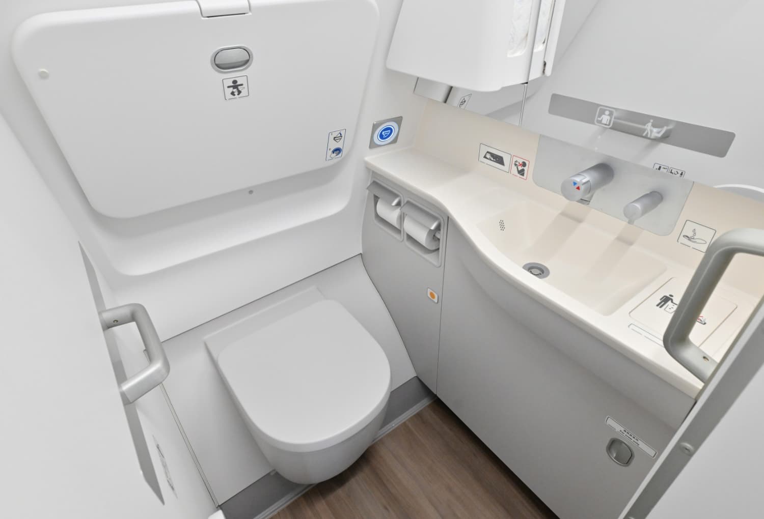 どなたでも安心・安全に空の旅を楽しんでいただけるよう、機内設備のユニバーサルデザイン化を進めました。前方の化粧室は、車いすをご利用のお客さまにも安心してお使いいただけるよう、起居をサポートする手すりや、便座への移動を補助するトランスファーシート、万が一の際に低い位置からでも押せるクルーコールボタンなどを備えています。機内の案内表示には、世界標準の「ピクトグラム(絵文字)」を採用しました。言葉がわからなくても直感的に伝わるため、言語や年齢に関係なく、スムーズに設備をご利用いただけます。