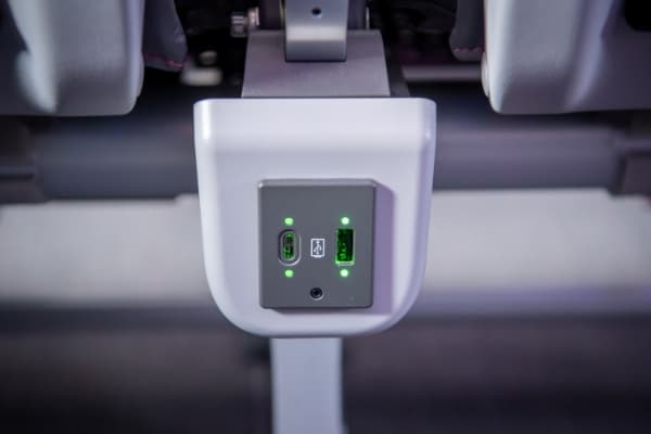 幅広いデバイスに対応可能なUSBポート(Type-A + Type-C)が窓側・中央・通路側、どの席からでも使用可能です。スマートフォンやタブレットの電池切れを気にせずお過ごしいただけます。