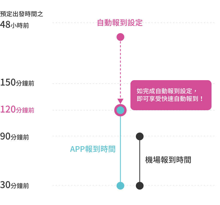 可事先於表定出發時間48小時設定報到手續的APP專屬功能。